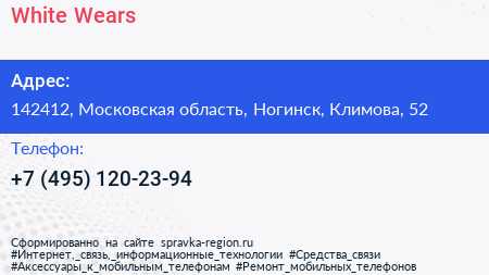 White Wears по адресу 142412, Московская область, Ногинск, Климова, 52 в дальнейшем Организация, размещена в следующих категориях: