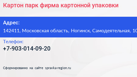 Картон-парк, фирма картонной упаковки по адресу 142411, Московская область, Ногинск, Самодеятельная, 10 в дальнейшем Организация, размещена в следующих категориях: