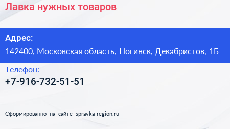 Лавка нужных товаров по адресу 142400, Московская область, Ногинск, Декабристов, 1Б в дальнейшем Организация, размещена в следующих категориях: