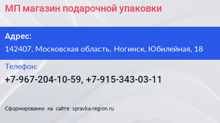 МП, магазин подарочной упаковки по адресу 142407, Московская область, Ногинск, Юбилейная, 18 в дальнейшем Организация, размещена в следующих категориях: