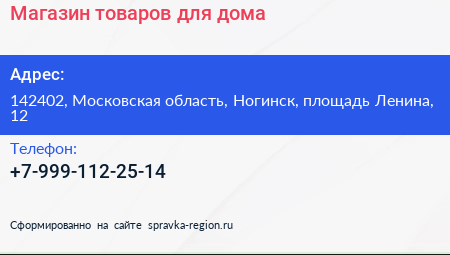 Магазин товаров для дома по адресу 142402, Московская область, Ногинск, площадь Ленина, 12 в дальнейшем Организация, размещена в следующих категориях: