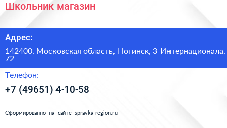 Школьник, магазин по адресу 142400, Московская область, Ногинск, 3 Интернационала, 72 в дальнейшем Организация, размещена в следующих категориях: