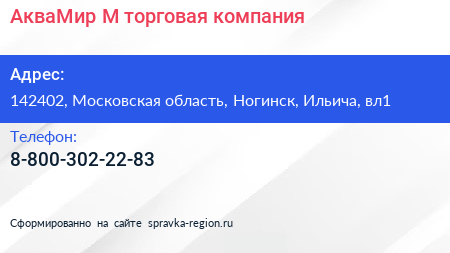 АкваМир-М, торговая компания по адресу 142402, Московская область, Ногинск, Ильича, вл1 в дальнейшем Организация, размещена в следующих категориях: