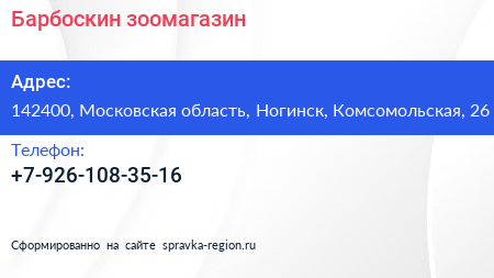 Барбоскин, зоомагазин по адресу 142400, Московская область, Ногинск, Комсомольская, 26 в дальнейшем Организация, размещена в следующих категориях: