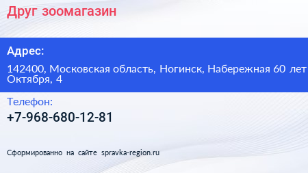 Друг, зоомагазин по адресу 142400, Московская область, Ногинск, Набережная 60 лет Октября, 4 в дальнейшем Организация, размещена в следующих категориях: