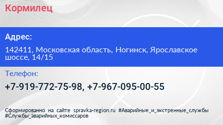 Кормилец по адресу 142411, Московская область, Ногинск, Ярославское шоссе, 14/15 в дальнейшем Организация, размещена в следующих категориях: