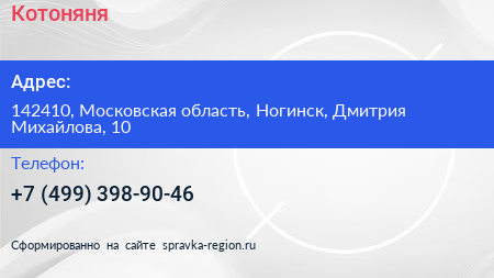 Котоняня по адресу 142410, Московская область, Ногинск, Дмитрия Михайлова, 10 в дальнейшем Организация, размещена в следующих категориях: