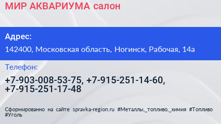 МИР АКВАРИУМА, салон по адресу 142400, Московская область, Ногинск, Рабочая, 14а в дальнейшем Организация, размещена в следующих категориях: