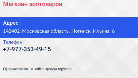 Магазин зоотоваров по адресу 142402, Московская область, Ногинск, Ильича, 6 в дальнейшем Организация, размещена в следующих категориях: