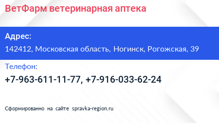 ВетФарм, ветеринарная аптека по адресу 142412, Московская область, Ногинск, Рогожская, 39 в дальнейшем Организация, размещена в следующих категориях: