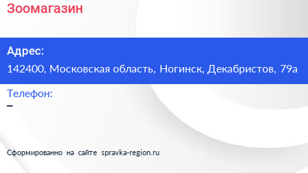 Зоомагазин по адресу 142400, Московская область, Ногинск, Декабристов, 79а в дальнейшем Организация, размещена в следующих категориях: