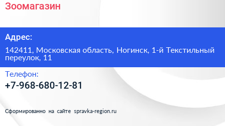Зоомагазин по адресу 142411, Московская область, Ногинск, 1-й Текстильный переулок, 11 в дальнейшем Организация, размещена в следующих категориях: