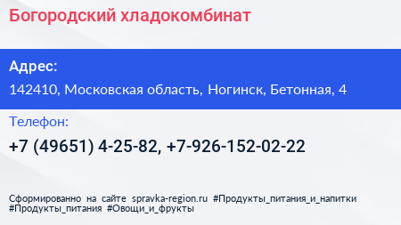 Богородский хладокомбинат по адресу 142410, Московская область, Ногинск, Бетонная, 4 в дальнейшем Организация, размещена в следующих категориях:
