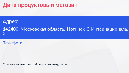Дина, продуктовый магазин по адресу 142400, Московская область, Ногинск, 3 Интернационала, 3 в дальнейшем Организация, размещена в следующих категориях: