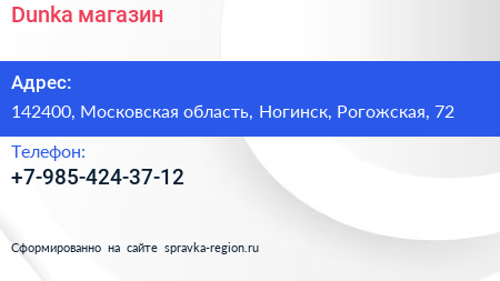 Dunka, магазин по адресу 142400, Московская область, Ногинск, Рогожская, 72 в дальнейшем Организация, размещена в следующих категориях: