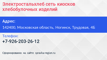 Электростальхлеб, сеть киосков хлебобулочных изделий по адресу 142400, Московская область, Ногинск, Трудовая, 4Б в дальнейшем Организация, размещена в следующих категориях: