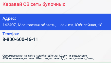 Каравай СВ, сеть булочных по адресу 142407, Московская область, Ногинск, Юбилейная, 18 в дальнейшем Организация, размещена в следующих категориях: