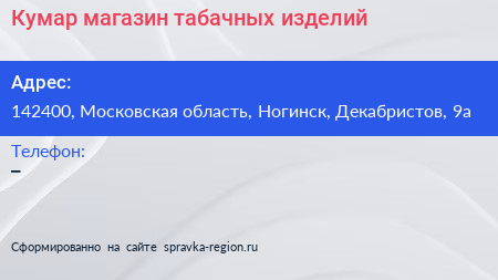 Кумар, магазин табачных изделий по адресу 142400, Московская область, Ногинск, Декабристов, 9а в дальнейшем Организация, размещена в следующих категориях: