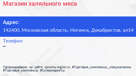 Магазин халяльного мяса по адресу 142400, Московская область, Ногинск, Декабристов, вл14 в дальнейшем Организация, размещена в следующих категориях: