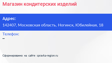 Магазин кондитерских изделий по адресу 142407, Московская область, Ногинск, Юбилейная, 18 в дальнейшем Организация, размещена в следующих категориях: