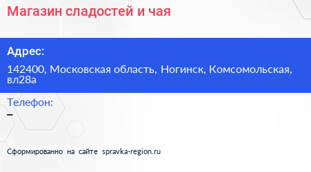 Магазин сладостей и чая по адресу 142400, Московская область, Ногинск, Комсомольская, вл28а в дальнейшем Организация, размещена в следующих категориях: