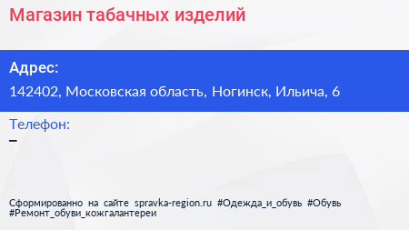 Магазин табачных изделий по адресу 142402, Московская область, Ногинск, Ильича, 6 в дальнейшем Организация, размещена в следующих категориях: