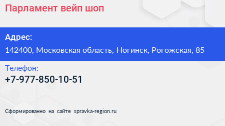 Парламент, вейп-шоп по адресу 142400, Московская область, Ногинск, Рогожская, 85 в дальнейшем Организация, размещена в следующих категориях:
