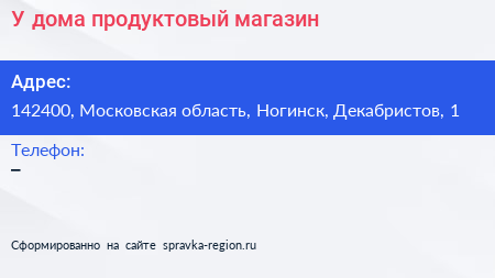 У дома, продуктовый магазин по адресу 142400, Московская область, Ногинск, Декабристов, 1 в дальнейшем Организация, размещена в следующих категориях: