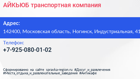 АЙКЬЮБ, транспортная компания по адресу 142400, Московская область, Ногинск, Индустриальная, 41 в дальнейшем Организация, размещена в следующих категориях: