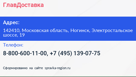 ГлавДоставка по адресу 142410, Московская область, Ногинск, Электростальское шоссе, 19 в дальнейшем Организация, размещена в следующих категориях: