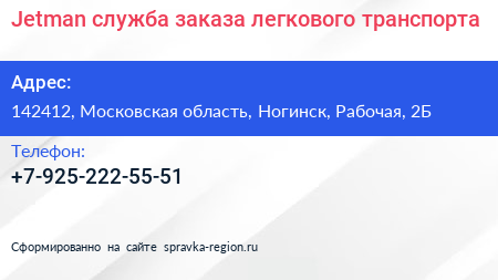 Jetman, служба заказа легкового транспорта по адресу 142412, Московская область, Ногинск, Рабочая, 2Б в дальнейшем Организация, размещена в следующих категориях:
