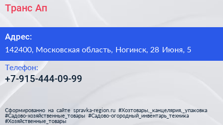 Транс-Ап по адресу 142400, Московская область, Ногинск, 28 Июня, 5 в дальнейшем Организация, размещена в следующих категориях:
