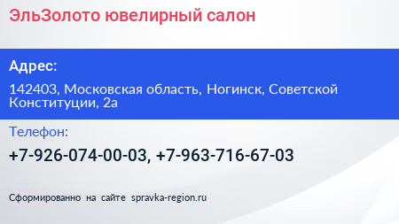 ЭльЗолото, ювелирный салон по адресу 142403, Московская область, Ногинск, Советской Конституции, 2а в дальнейшем Организация, размещена в следующих категориях: