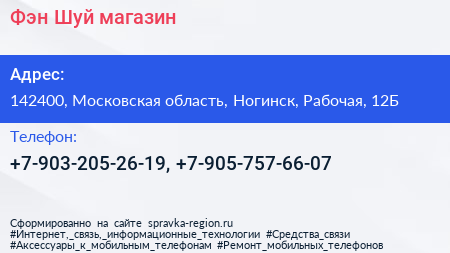 Фэн-Шуй, магазин по адресу 142400, Московская область, Ногинск, Рабочая, 12Б в дальнейшем Организация, размещена в следующих категориях: