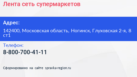 Лента, сеть супермаркетов по адресу 142400, Московская область, Ногинск, Глуховская 2-я, 8 ст1 в дальнейшем Организация, размещена в следующих категориях: