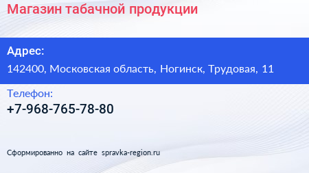 Магазин табачной продукции по адресу 142400, Московская область, Ногинск, Трудовая, 11 в дальнейшем Организация, размещена в следующих категориях: