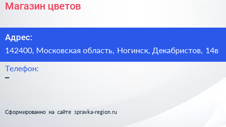 Магазин цветов по адресу 142400, Московская область, Ногинск, Декабристов, 14в в дальнейшем Организация, размещена в следующих категориях: