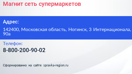 Магнит, сеть супермаркетов по адресу 142400, Московская область, Ногинск, 3 Интернационала, 90а в дальнейшем Организация, размещена в следующих категориях: