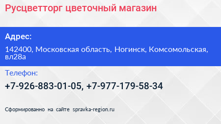 Русцветторг, цветочный магазин по адресу 142400, Московская область, Ногинск, Комсомольская, вл28а в дальнейшем Организация, размещена в следующих категориях: