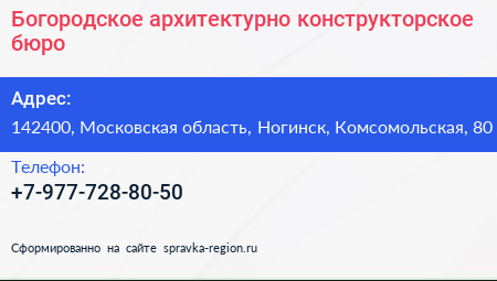 Богородское, архитектурно-конструкторское бюро по адресу 142400, Московская область, Ногинск, Комсомольская, 80 в дальнейшем Организация, размещена в следующих категориях: