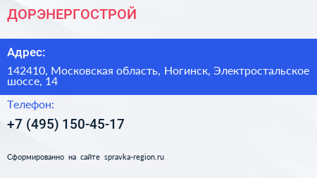 ДОРЭНЕРГОСТРОЙ по адресу 142410, Московская область, Ногинск, Электростальское шоссе, 14 в дальнейшем Организация, размещена в следующих категориях: