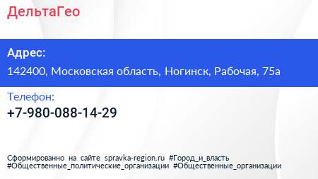 ДельтаГео по адресу 142400, Московская область, Ногинск, Рабочая, 75а в дальнейшем Организация, размещена в следующих категориях: