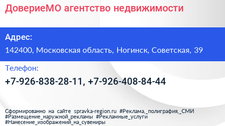 ДовериеМО, агентство недвижимости по адресу 142400, Московская область, Ногинск, Советская, 39 в дальнейшем Организация, размещена в следующих категориях: