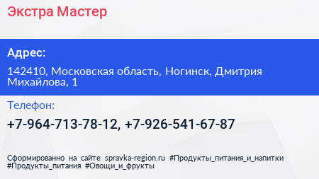 Экстра-Мастер по адресу 142410, Московская область, Ногинск, Дмитрия Михайлова, 1 в дальнейшем Организация, размещена в следующих категориях: