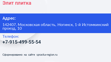 Элит-плитка по адресу 142407, Московская область, Ногинск, 1-й Истомкинский проезд, 10 в дальнейшем Организация, размещена в следующих категориях:
