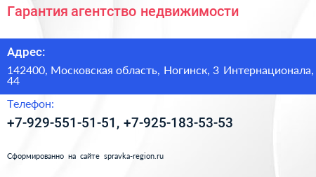 Гарантия, агентство недвижимости по адресу 142400, Московская область, Ногинск, 3 Интернационала, 44 в дальнейшем Организация, размещена в следующих категориях: