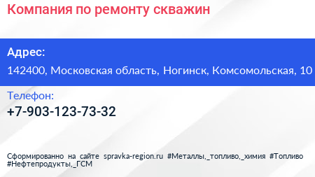 Компания по ремонту скважин по адресу 142400, Московская область, Ногинск, Комсомольская, 10 в дальнейшем Организация, размещена в следующих категориях: