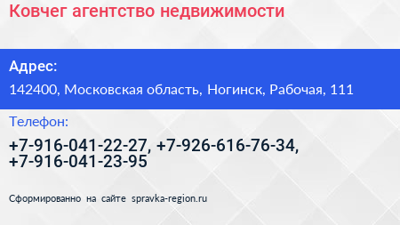 Ковчег, агентство недвижимости по адресу 142400, Московская область, Ногинск, Рабочая, 111 в дальнейшем Организация, размещена в следующих категориях: