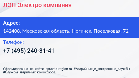 ЛЭП-Электро, компания по адресу 142408, Московская область, Ногинск, Поселковая, 72 в дальнейшем Организация, размещена в следующих категориях: