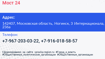Мост 24 по адресу 142407, Московская область, Ногинск, 3 Интернационала, 236а в дальнейшем Организация, размещена в следующих категориях: